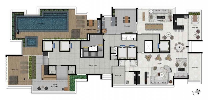 Lazer no pavimento térreo e na cobertura