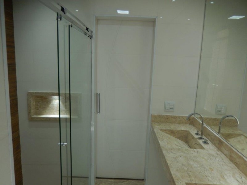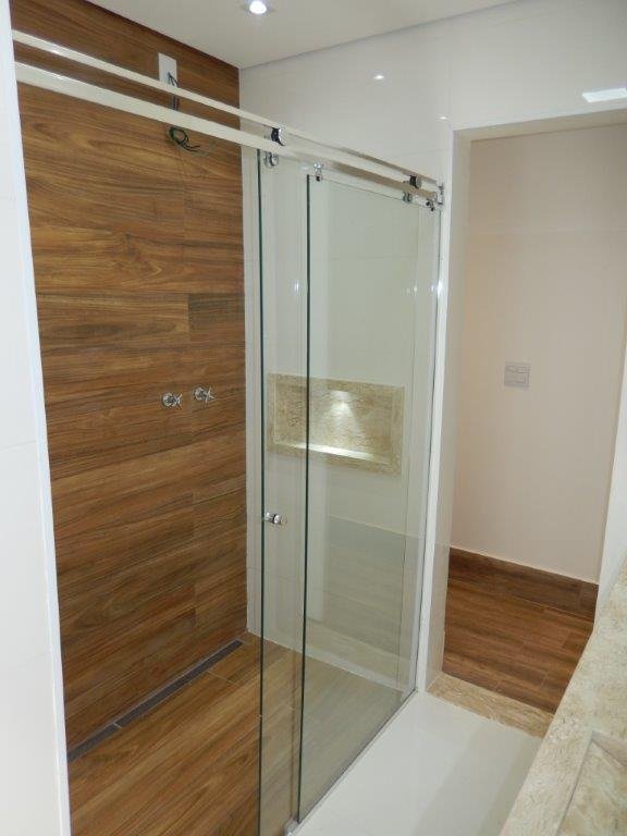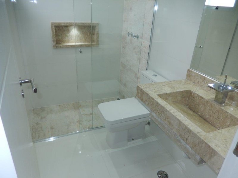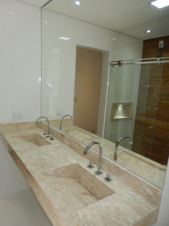Todos os banheiros com box modelo aqua marine, tomada para instalação de toalheiro térmico, ducha higiênica, espelhos, iluminação natural, bacias com assento soft close, pias esculpidas em mármore travertino, nichos com iluminação em led.