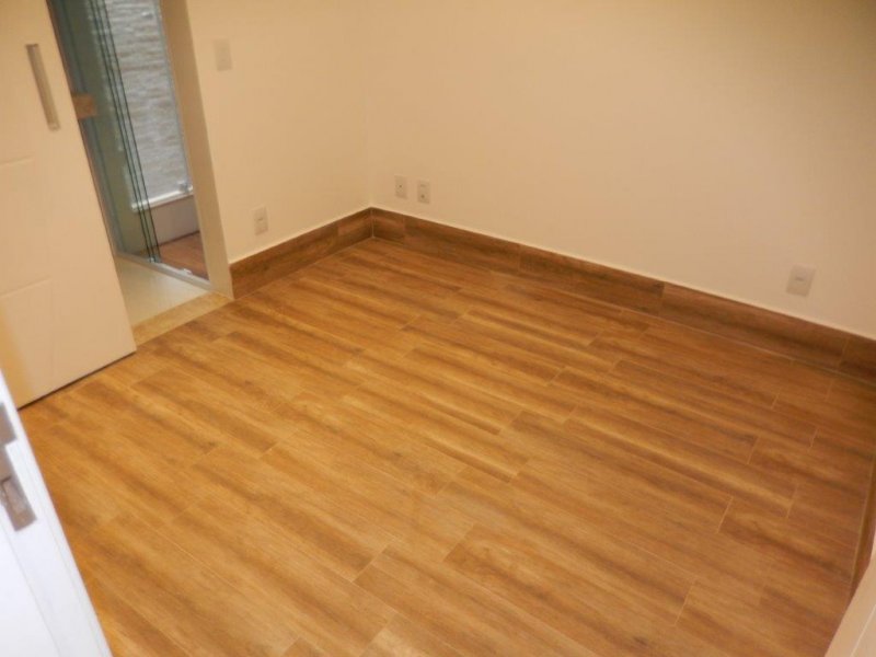 Sala dois ambientes com porcelanato de 70 x 70 cm lembrando madrepérola, com rodapé de 15 cm, parede com espelho em bisotê.