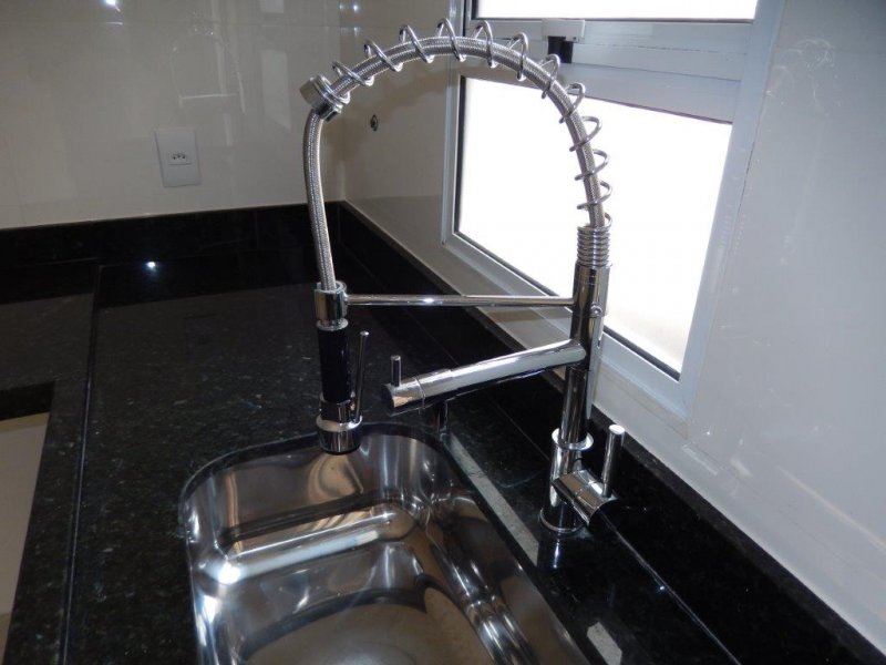 Cozinha com torneira gourmet, parede com revestimento branco 3D, pia em granito.