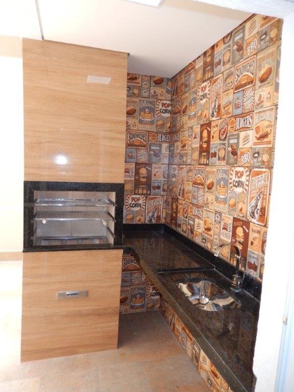 Área gourmet com churrasqueira iluminada internamente e exaustor para fumaça, revestida em porcelanato lembrando madeira, pia em granito.