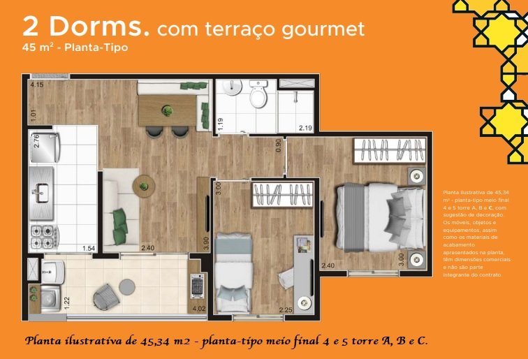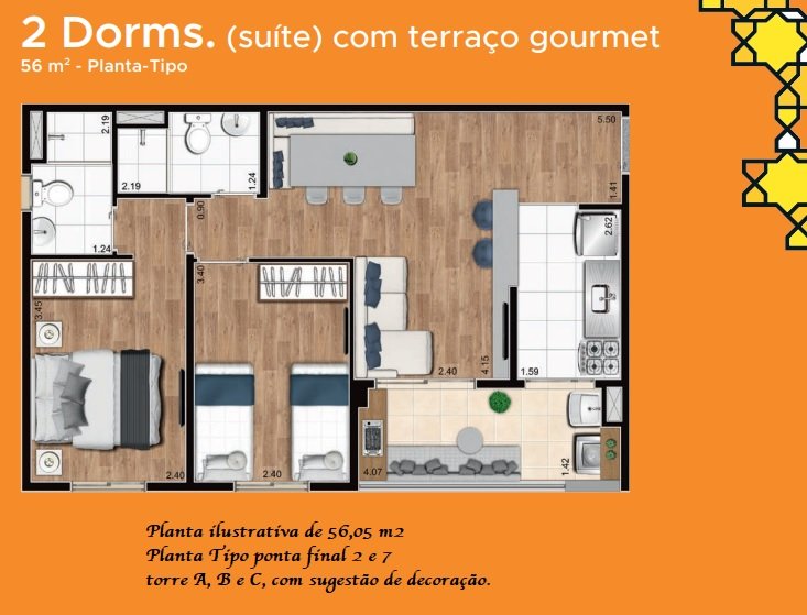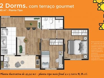 Apartamentos de 45 a 56 metros quadrados com 2 dormitórios, suíte, terraço gourmet e lazer completo.