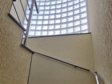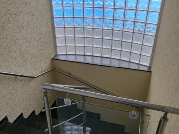 Escada em granito preto com iluminação com tijolo de vidro.